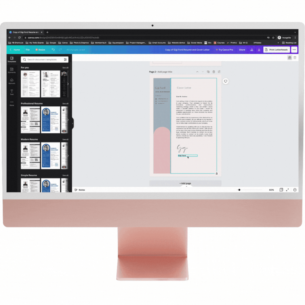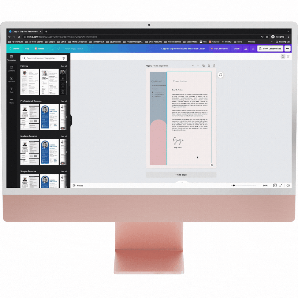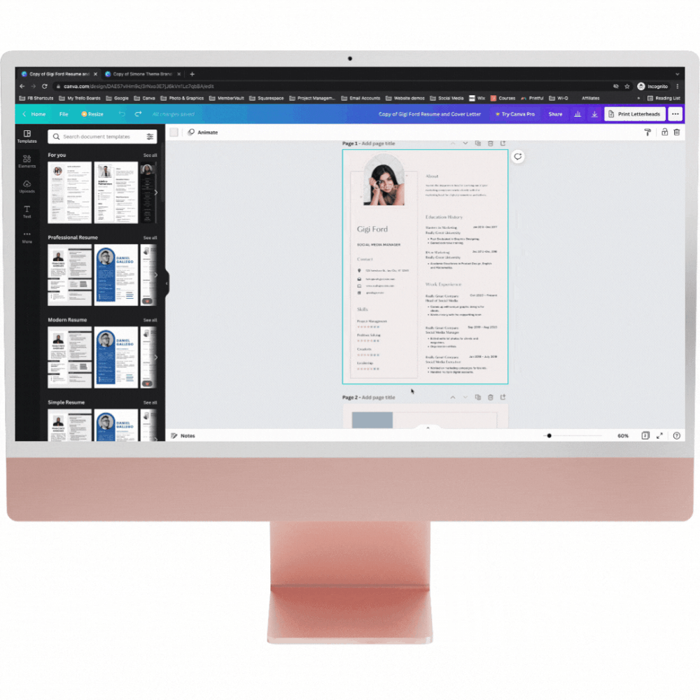 Your CV and cover letter template are available on one design. If you want to download them separately, you can by only selecting the page you need to download. You can also duplicate the resume page if you need to add another page to your CV. There is a duplicate button right above the first page of your design - just click on that and it’ll duplicate the page.